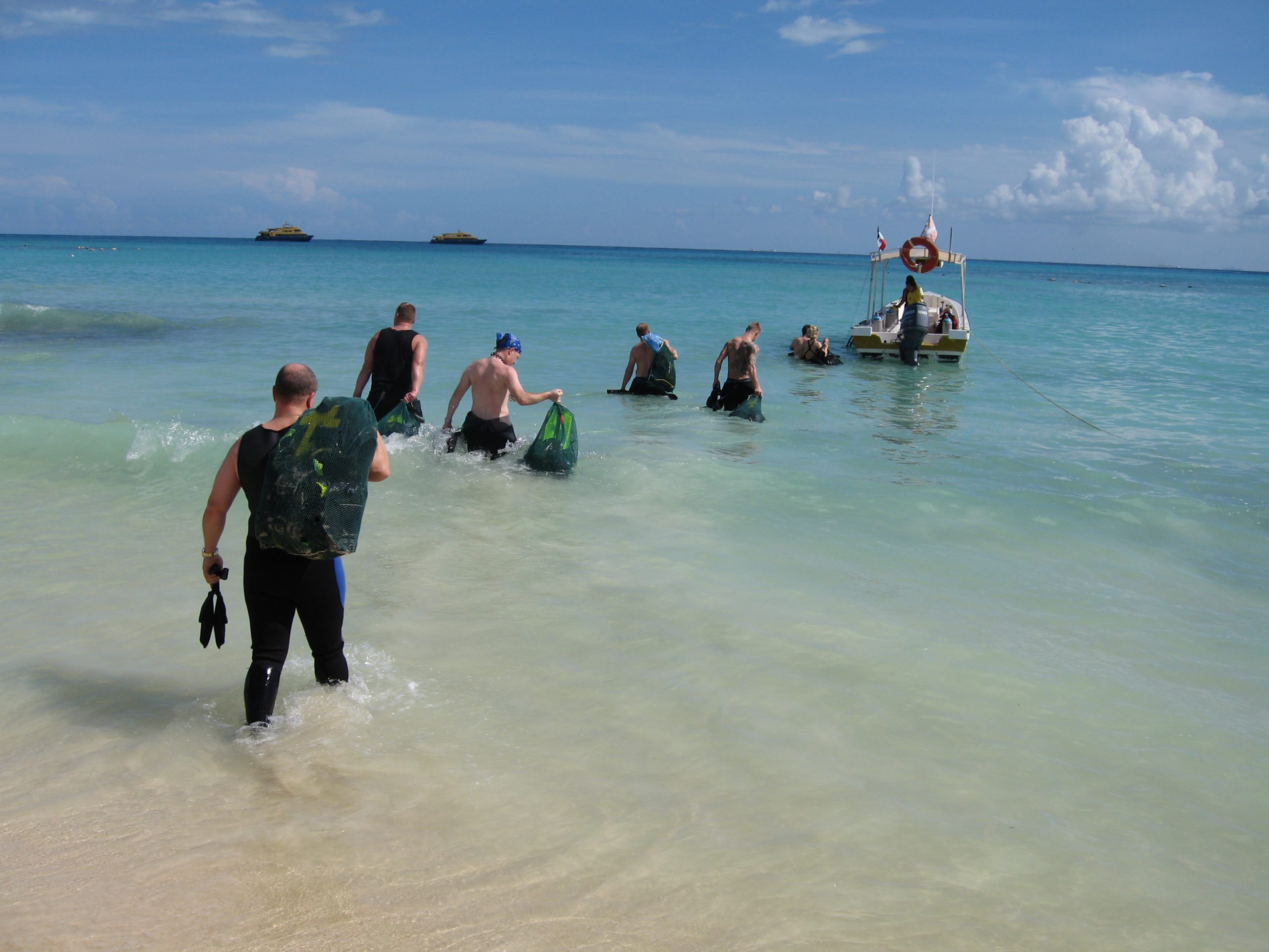 Dykkercenteret ligger 300 meter fra vandet, så vores grej blev kørt til vandet på en trehjulet cykel, vi gik til vandet , tog vores udstyr på nakken vadede ud i vandet til båden.