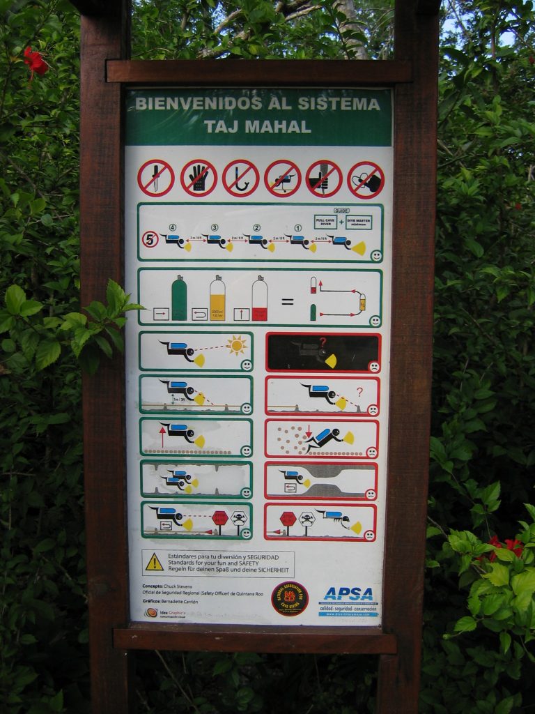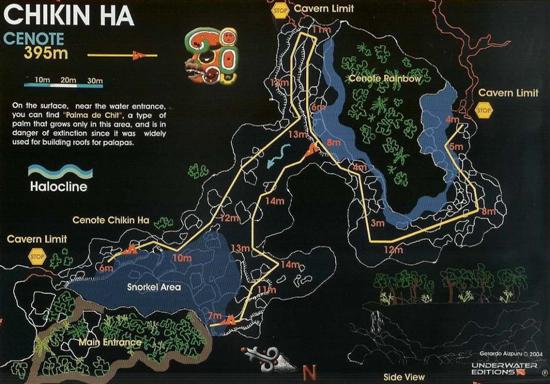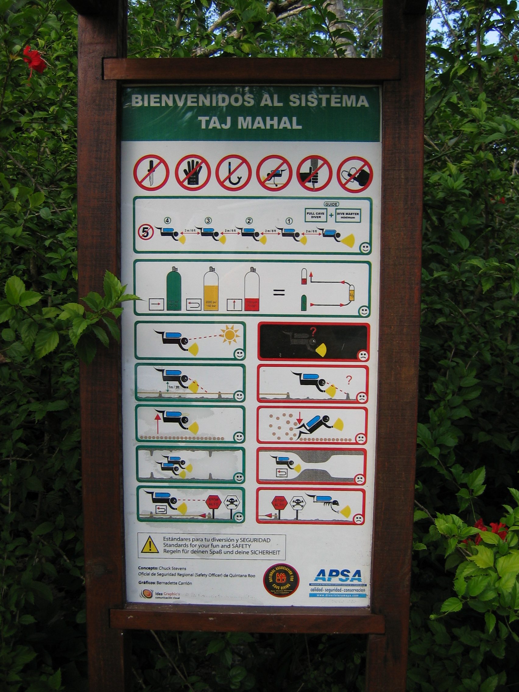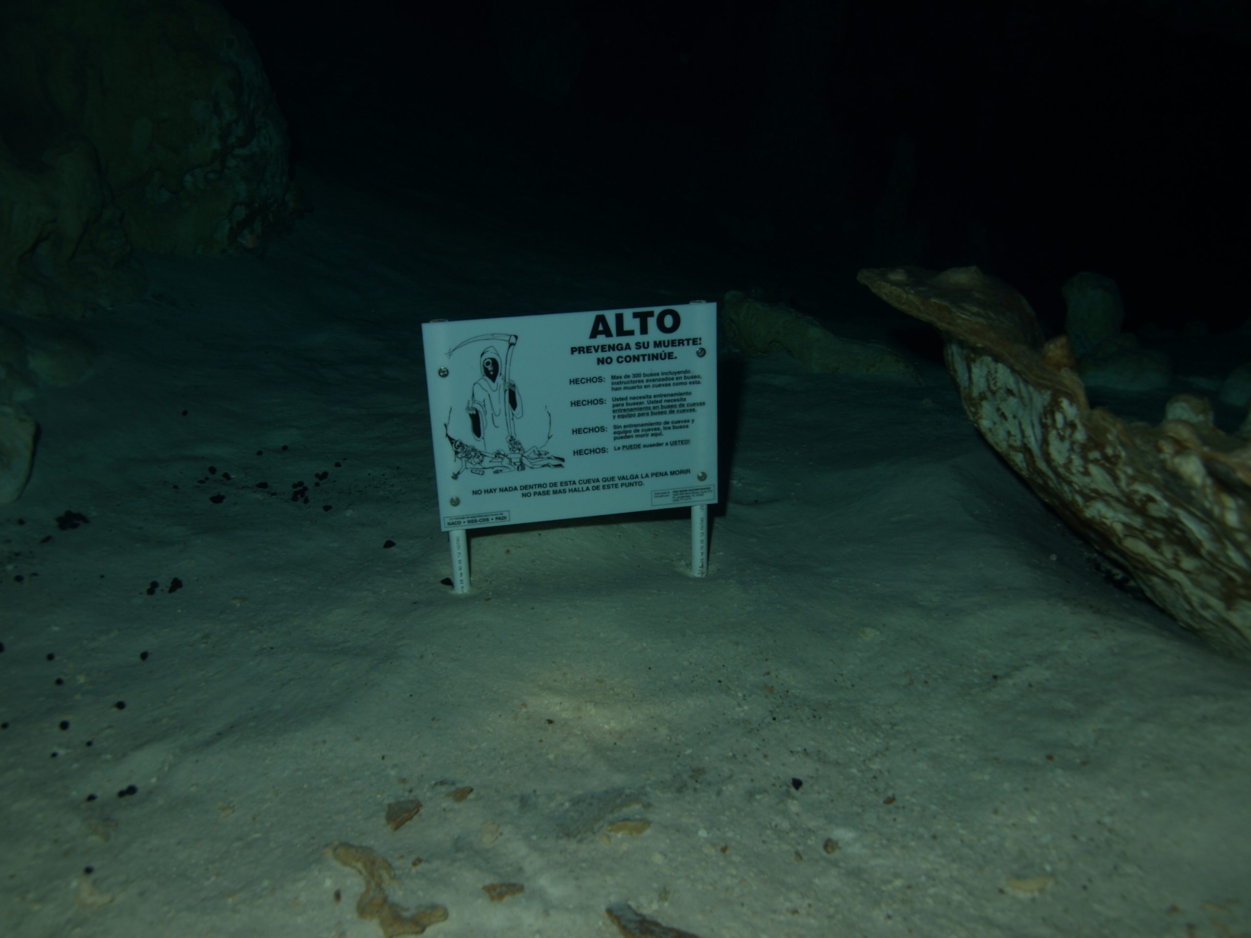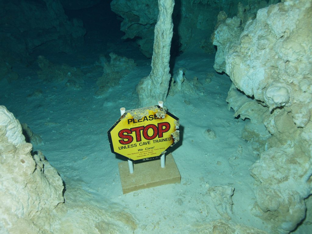 På kortet ses også nogle STOP skilte, de betyder at man IKKE skal dykke på den anden side af skiltet, gør man det er der risiko for at man ikke finder ud af hulen igen, idet der ikke er nogen udgang til overfladen efter skiltet, og ingen snor at følge .