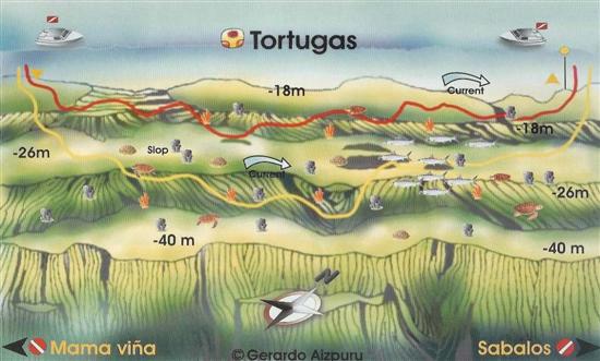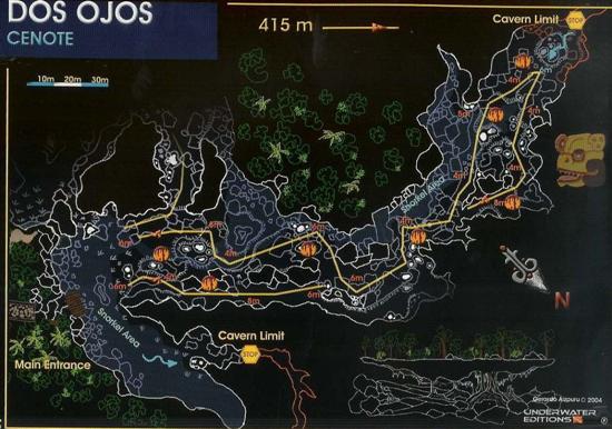 Læg mærke til den gule streg på kortet, det er snoren der er spændt ud under vandet, og som man skal følge, for at komme ud igen.